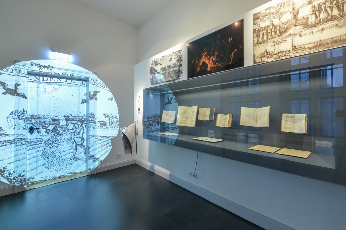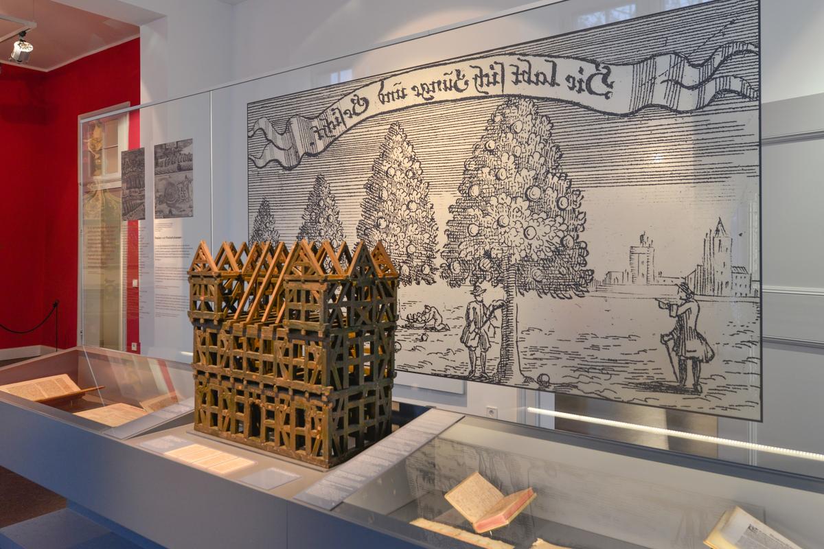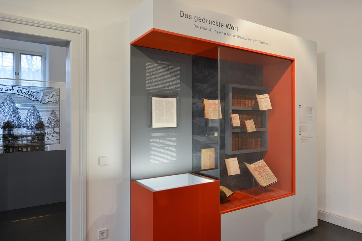 Die Räume, in denen Sie jetzt stehen, beherbergten über 150 Jahre lang die Apotheke des Waisenhauses. Heute finden Sie hier das Pietismuskabinett: eine Ausstellung, die unter dem Titel »Kraft des Wortes« die kulturgeschichtlichen Wirkungen des Halleschen Pietismus vorstellt. Im Mittelpunkt der Bewegung stand das WORT. Als Leitfaden der Ausstellung dient der Umgang mit dem Wort in seinen unterschiedlichen Ausdrucksformen: des gesprochenen, geschriebenen, gedruckten, dichterisch verarbeiteten, gesungenen und übersetzten Wortes.