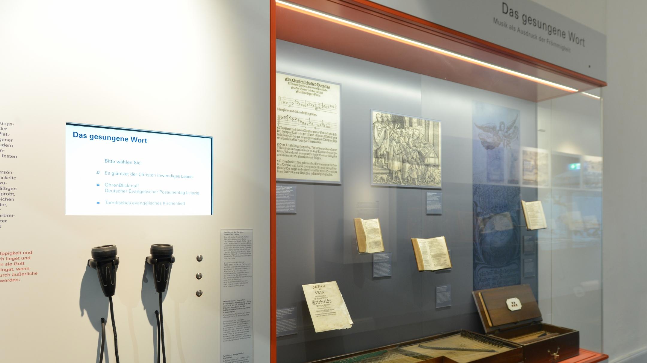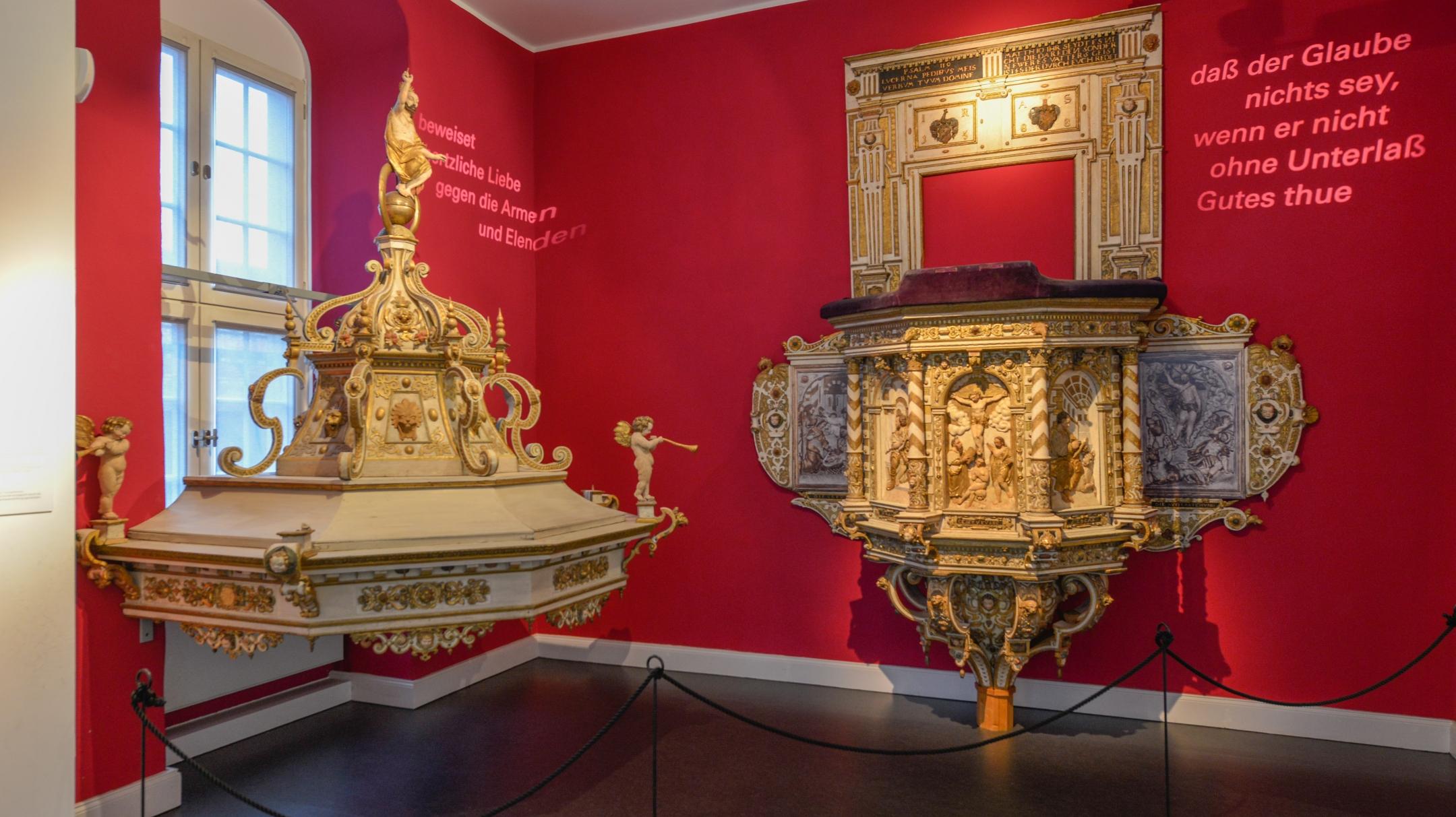Auch hier geht es um das gesprochene Wort. Im Verständnis Franckes eignete sich die Predigt ganz besonders zur persönlichen Ansprache und Bekehrung der Zuhörer. Das erforderte eine besondere Schulung der Theologen zu einer einfachen, verständlichen und bildreichen Sprache. Die Predigt sollte zu Herzen gehen und zur Besinnung über das Gehörte anregen, um letztendlich positiv auf die persönliche Lebensführung zu wirken. Als herausragendes Leitexponat der gesamten Ausstellung ist hier die wunderschöne Renaissancekanzel aus der St. Ulrichs-Kirche in Halle ausgestellt, von der August Hermann Francke ab 1715 als Pfarrer der Ulrichs-Gemeinde predigte.