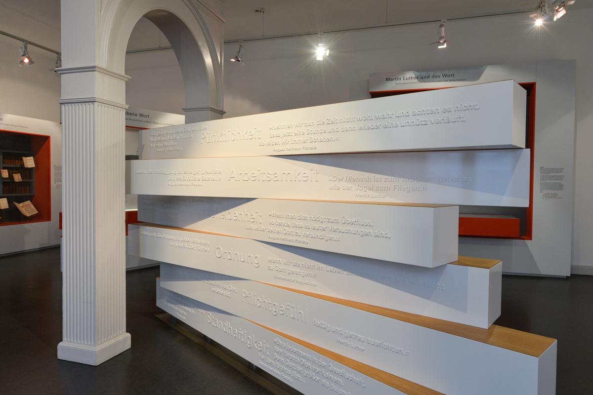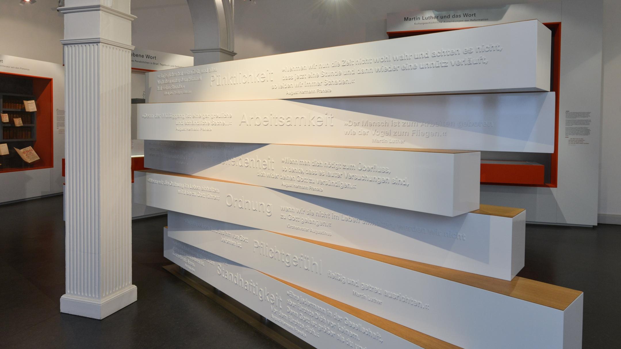 In der Mitte des Raumes befindet sich eine Installation mit übereinander liegenden Balken, die in unterschiedliche Richtungen weisen. Sie versinnbildlicht den Wertekanon, der an den Schulen Franckes erstmals ganzen Schülergenerationen systematisch anerzogen wurde und der bis heute in unserer Gesellschaft nachwirkt.