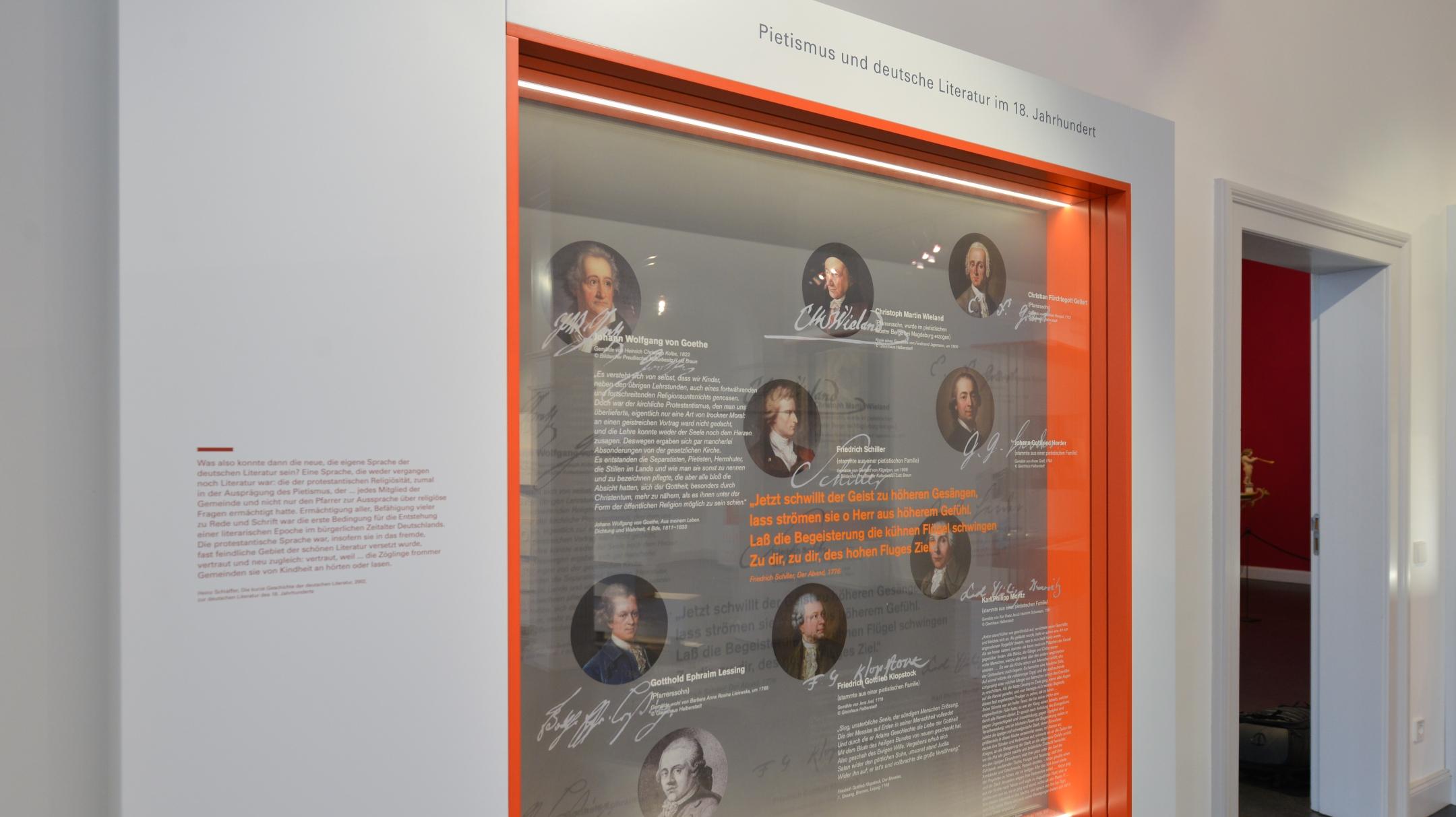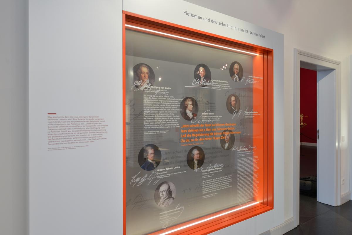 Dieser Abschnitt der Ausstellung thematisiert den erstaunlich tiefgreifenden Einfluss des Pietismus auf Literatur und Dichtung. Ganz in der lutherischen Tradition kultivierte der Pietismus die Sprache auch in dieser Hinsicht. Sein bedeutendster Beitrag zur deutschen Literatur war die geistliche Lyrik, die durch Gefühlsinnigkeit und sprachliche Kraft gekennzeichnet war.